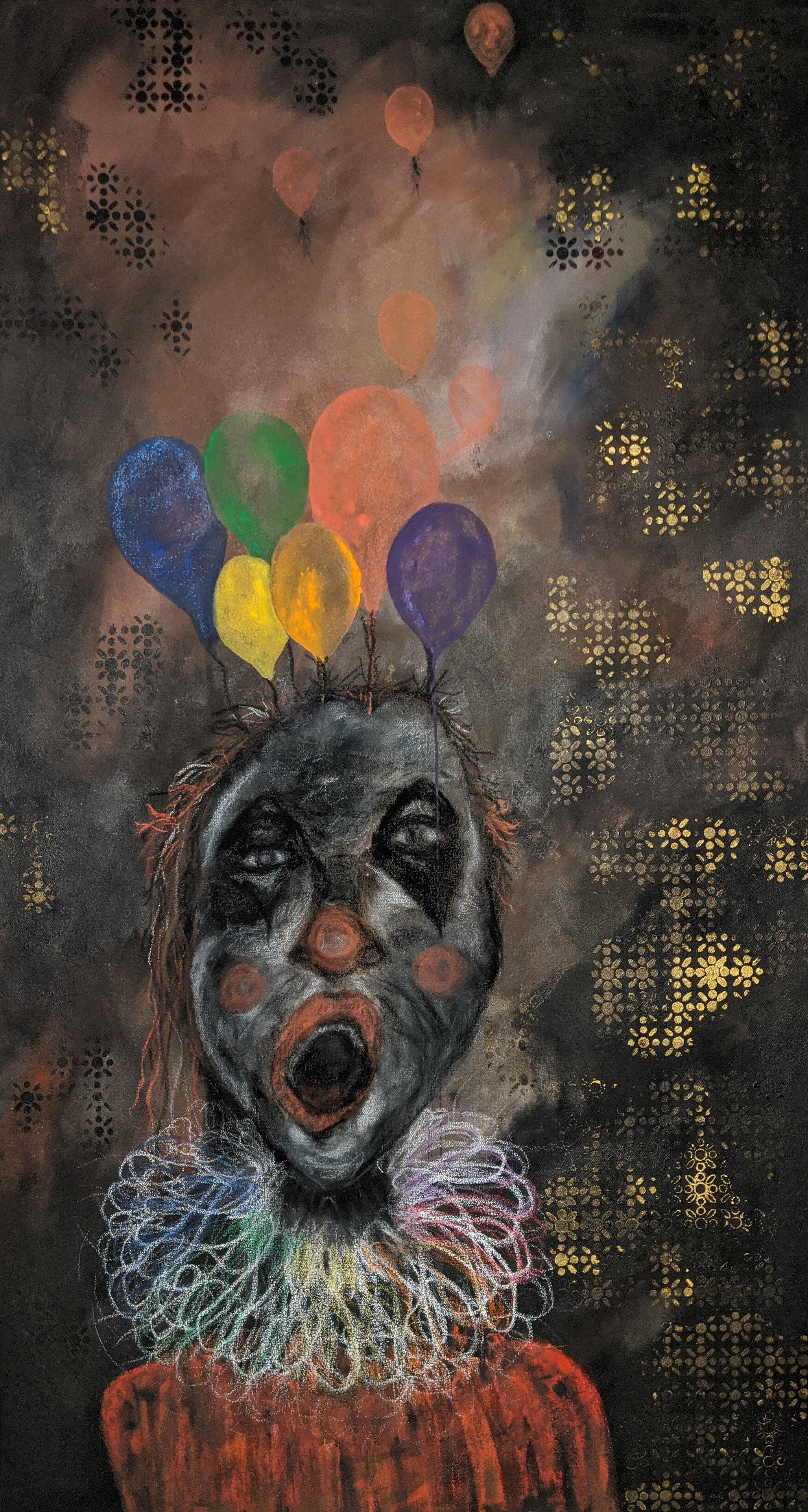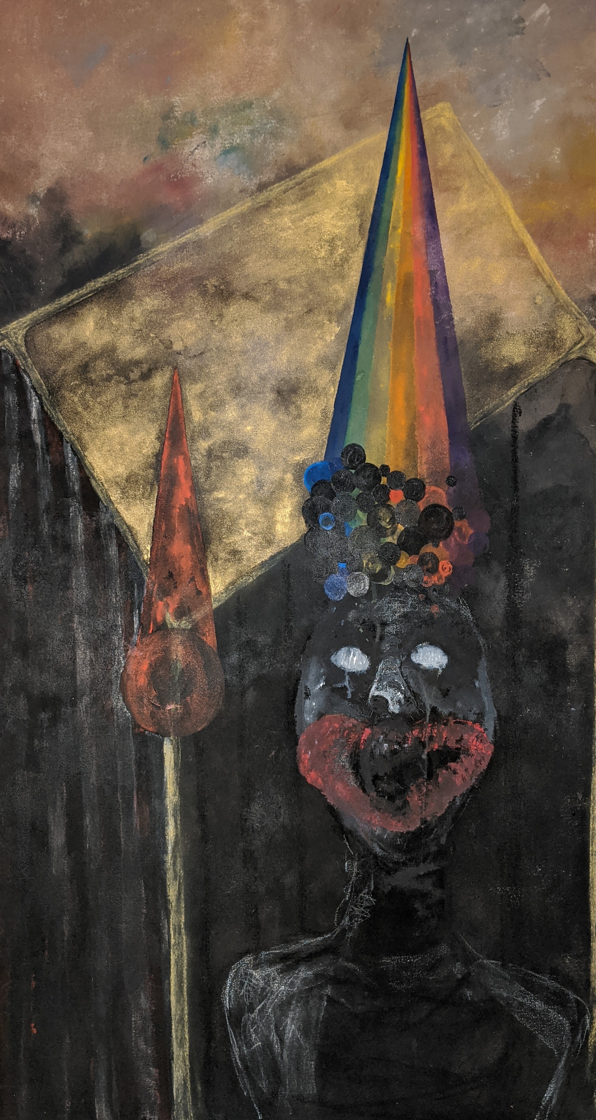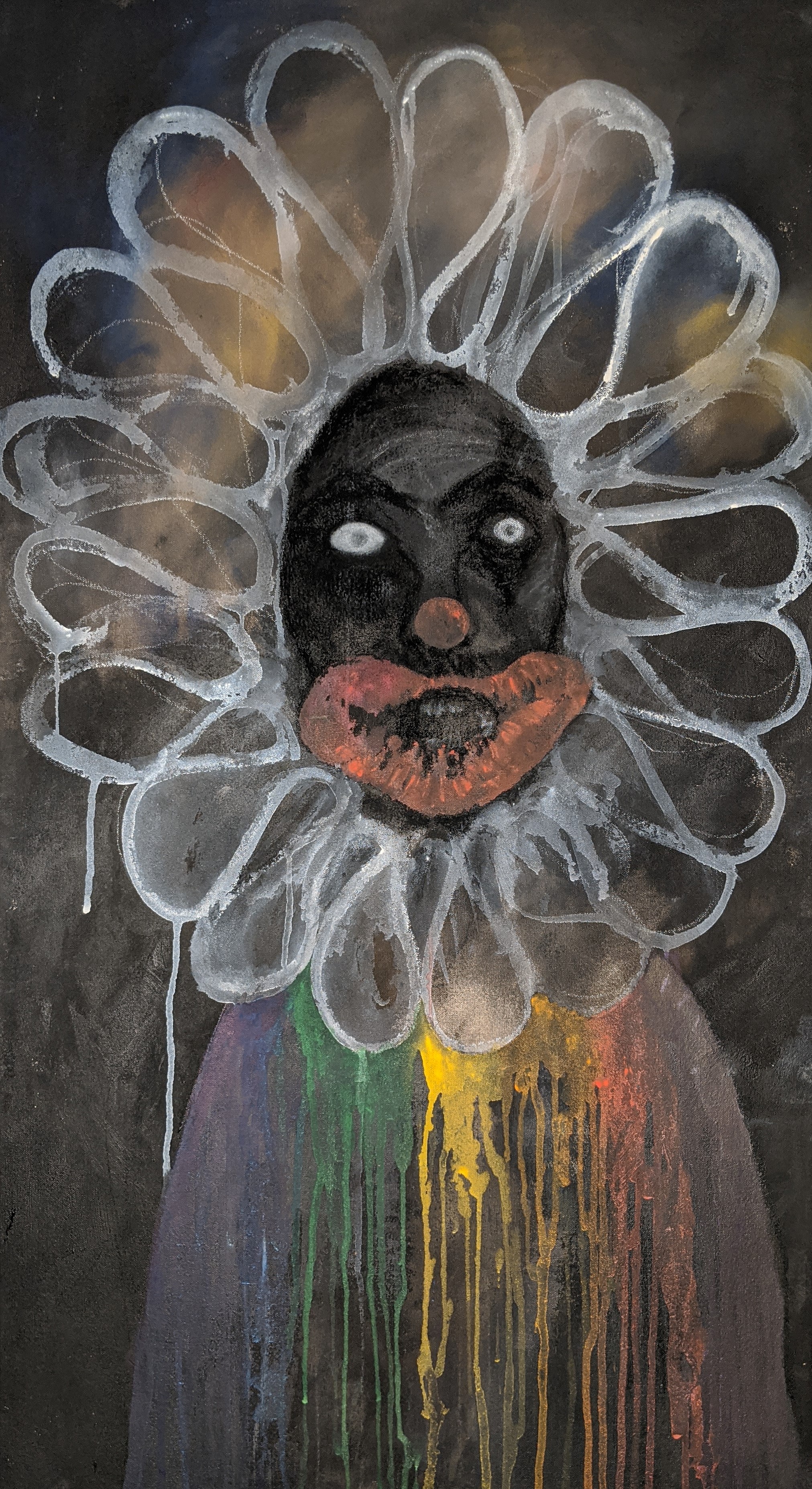 This body of work began from having a series of hypnopompic hallucinations. Waking up and seeing projections of my dream state with my eyes open in complete darkness. The figures appear to be in black and white with shards and prisms of colorful light reflecting into rainbow patterns, drips, lines and bubbles. The figures are visibly in pain and reaching out, terrified and saddened. Their mouths forming silent screams and appear to be aging and distorting before my eyes. I struggle to see clearly in the darkness as these images break up, fade in and out and often become too dark to see. Often, they appear to be wearing circus and religious garb or nothing at all, looking fragile, slow and have no distinct gender. I am still working out these visuals and concepts within my subconscious, combined with my interests in historical and cultural traditions within societies which both separate and unite humanity. The insertion of various elements from my life experiences, places, memories, literature and the arts also make their way throughout. Working on unprimed canvas has given me both the tactile experience of building my surface from raw cloth while forcing the paint into the canvas, as well as the quality of color, light and the darkness in my visions. Materials used are acrylic, watercolor, charcoal and pastel.