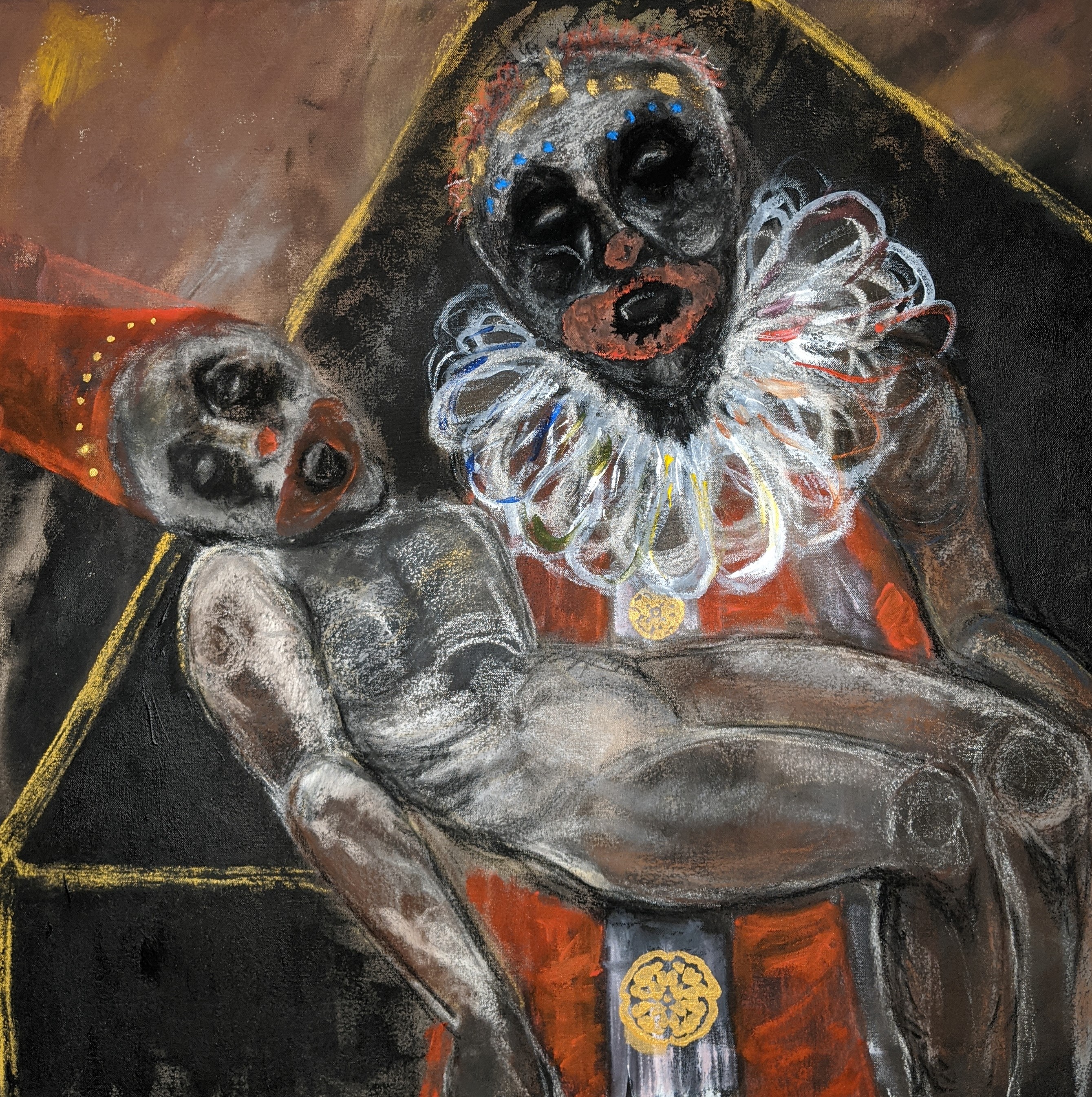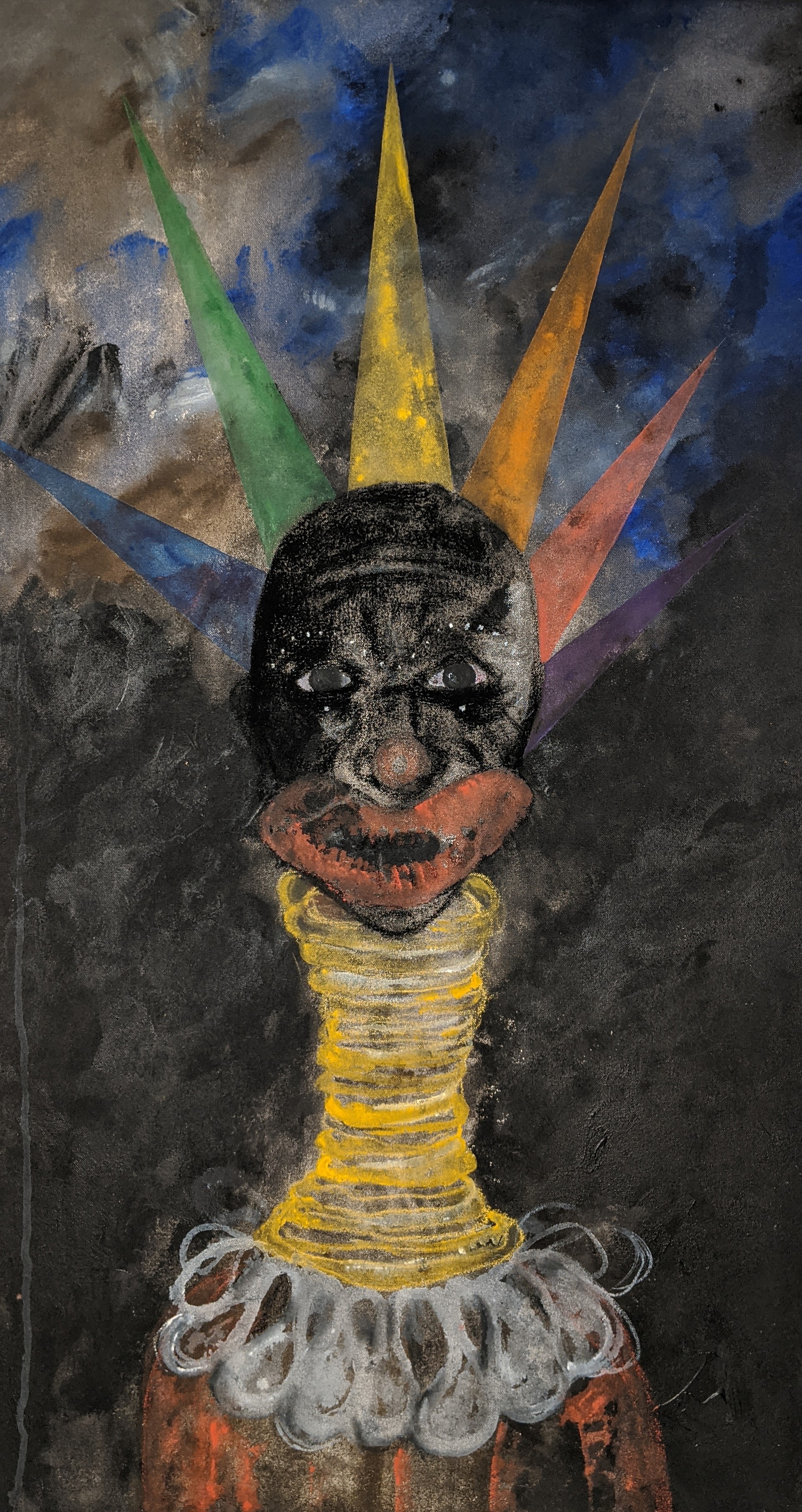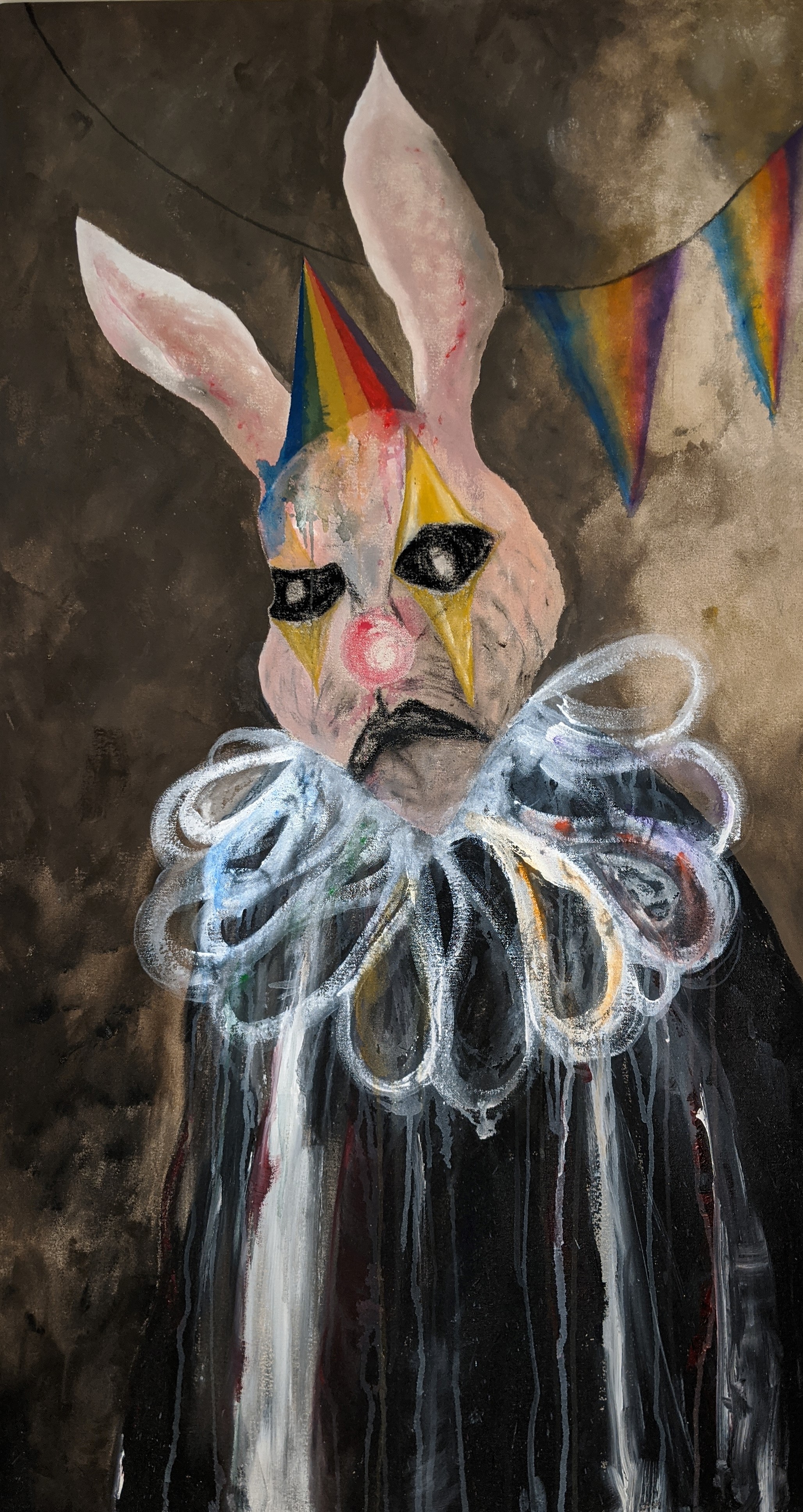 This body of work began from having a series of hypnopompic hallucinations. Waking up and seeing projections of my dream state with my eyes open in complete darkness. The figures appear to be in black and white with shards and prisms of colorful light reflecting into rainbow patterns, drips, lines and bubbles. The figures are visibly in pain and reaching out, terrified and saddened. Their mouths forming silent screams and appear to be aging and distorting before my eyes. I struggle to see clearly in the darkness as these images break up, fade in and out and often become too dark to see. Often, they appear to be wearing circus and religious garb or nothing at all, looking fragile, slow and have no distinct gender. I am still working out these visuals and concepts within my subconscious, combined with my interests in historical and cultural traditions within societies which both separate and unite humanity. The insertion of various elements from my life experiences, places, memories, literature and the arts also make their way throughout. Working on unprimed canvas has given me both the tactile experience of building my surface from raw cloth while forcing the paint into the canvas, as well as the quality of color, light and the darkness in my visions. Materials used are acrylic, watercolor, charcoal and pastel.